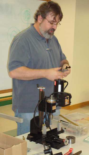 Stan Stocker presented his talk last to the assembled members and it was certainly well worth the wait. Stan spoke about some of the challenges that confront horologists as they repair old clocks. For those who are unaware, Stan has been repairing clocks for years near Front Royal and so there was a high level of interest in what Stan was going to share. Stan is also an engaging and animated speaker making his presentation all that much better. Stan spoke about various clockmaking techniques, clock bushings, burnishers, and repivoting - the reconditioning of pivots - amongst a variety of horological related information. Stan noted that clocks are astonishingly sloppy compared to typical tolerance standards of thousands or even tens-of-thousands of an inch such as most machinists are used to dealing with. Stan noted that too close tolerance will result in excessive friction, which the typical mainspring cannot power more than a few minutes. Stan noted that one principle that helps clockmakers is that clocks gear up; not gear down. Stan spoke about commercial practices and then showed the Club a bushing device that he fabricated in his own shop. Stan also shared a technique told to him by Jerry Kieffer to readily align a center point when using a Sherline mill, a drill chuck and a light. Stan also recommended to the club that they grind a radius or dome on the hammer end of punches so that a mistrike will have less chance of damaging the work piece. Other topics addressed by Stan were to search out a good jewelers saw (he recommended considering a Robay); how to replace a missing tooth in a gear (this alone made a long drive to the meeting worthwhile); and a "one-dip" cleaner.